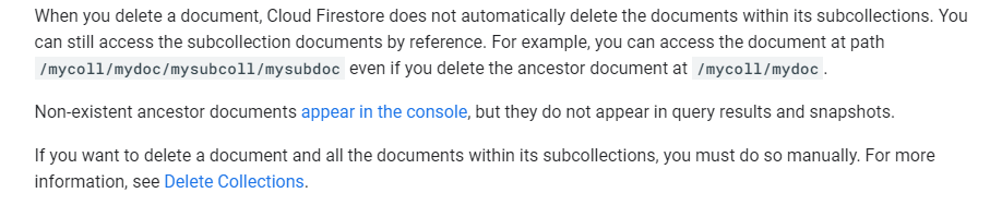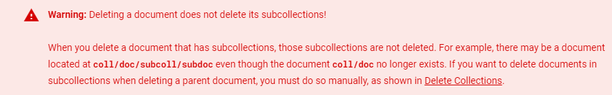 서브 컬렉션을 가지고 있는 상위 문서를 삭제하면 하위 서브 컬렉션은 삭제되지 않는다.