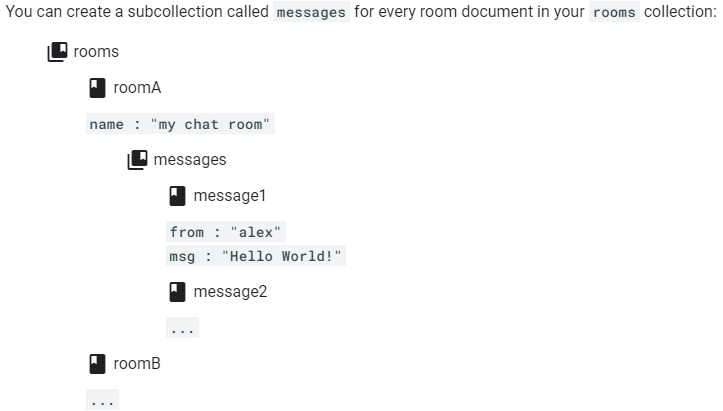 roomA 문서에 서브 컬렉션 messages를 만들고 메세지 하나마다 문서하나에 해당되도록 생성