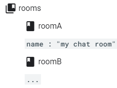다음과 같이 rooms(채팅방)컬렉션에 roomA(A방), roomB(B방)의 문서가 있다.