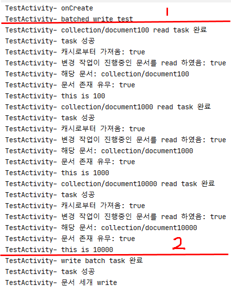 1표시 밑은 버튼을 눌러 캐시된 문서가 있는지 테스트해보면 오프라인인데 디바이스의 캐시에는 업데이트가 됨을 볼수 있다. 2표시 밑은 네트워크 연결 후 batch write task가 시작되고 끝나는 것을 볼 수 있다.