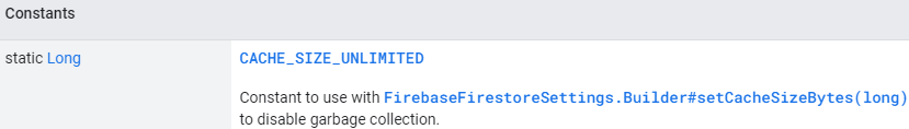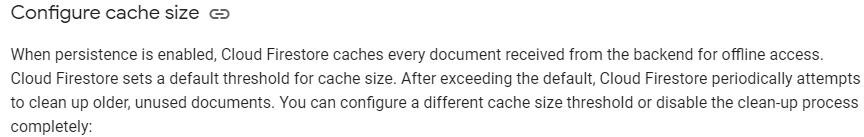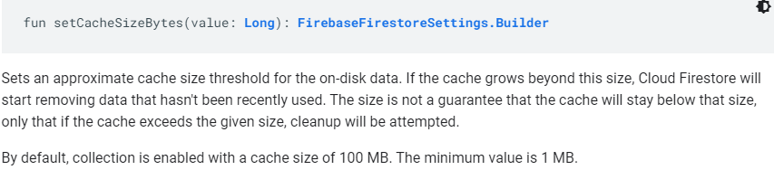 // The default cache size threshold is 100 MB. Configure "setCacheSizeBytes" // for a different threshold (minimum 1 MB) or set to "CACHE_SIZE_UNLIMITED" // to disable clean-up. val settings = FirebaseFirestoreSettings.Builder() .setCacheSizeBytes(FirebaseFirestoreSettings.CACHE_SIZE_UNLIMITED) .build() db.firestoreSettings = settingsdefault 100MB, 최소 1MB