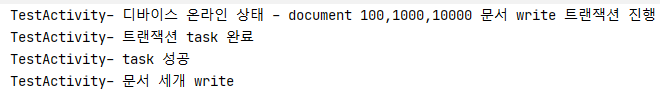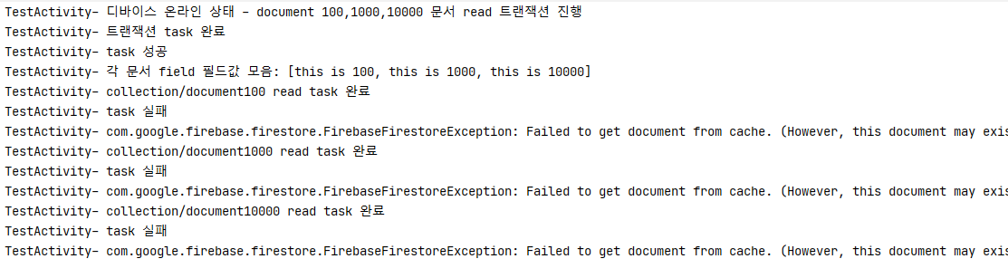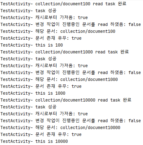 onCreate에서 트랜잭션 진행되고 트랜잭션 task 완료가 나올 때 버튼을 눌러 세 문서를 읽으면 캐싱되어 있지 않다.