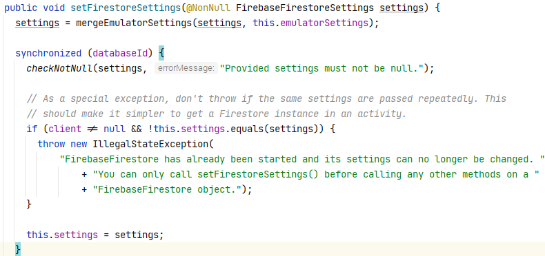 //kotlin + ktx val settings = firestoreSettings { isPersistenceEnabled = false } db.firestoreSettings = settings중간중간 지속성을 변경하면서 write,read등등을 할 수 있을 줄알았는데 Firebase 인스턴스화후 read,write작업을 한번이상이라도 한 상태에서 지속성 변경이 들어가면 앱이 crash난다.