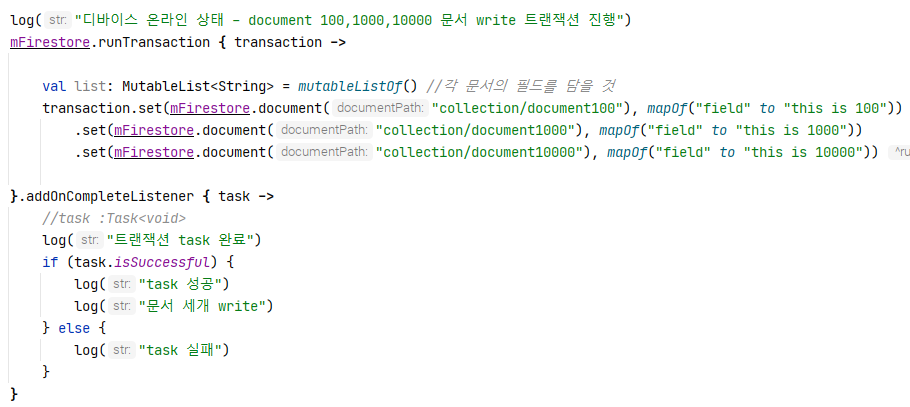 테스트 할때마다 코드를 바꿔가며 앱을 재실행해대니 불편해서 테스트 코드를 따로 짜봤더니 깨달은 내용이다.기본적으로 오프라인 상태에서 set(),update()메서드는 task가 시작되지 않고 큐에 들어가있다가 네트워크가 재연결 되는 순간에 작업이 시작된다.