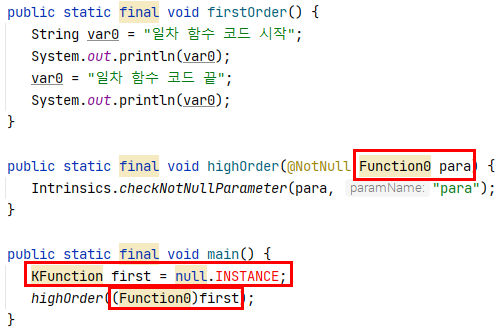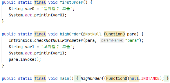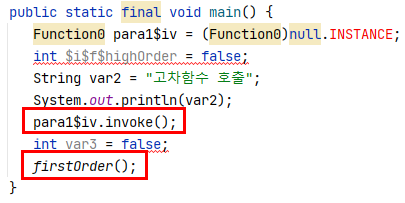 highOrder(...)호출 대신 코트들이 삽입된다. para가 inline이라서 Function구현 객체 생성대신 firstOrder()함수가 호출된다.