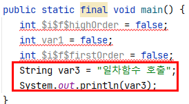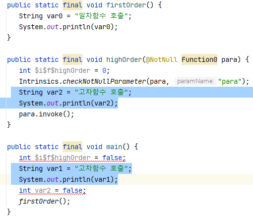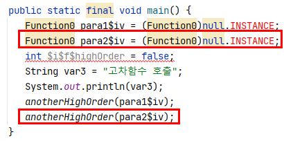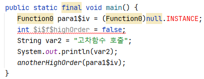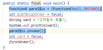 고차함수가 inline이여서 고차함수 호출(highOrder(...))대신 코드가 삽입되었다.