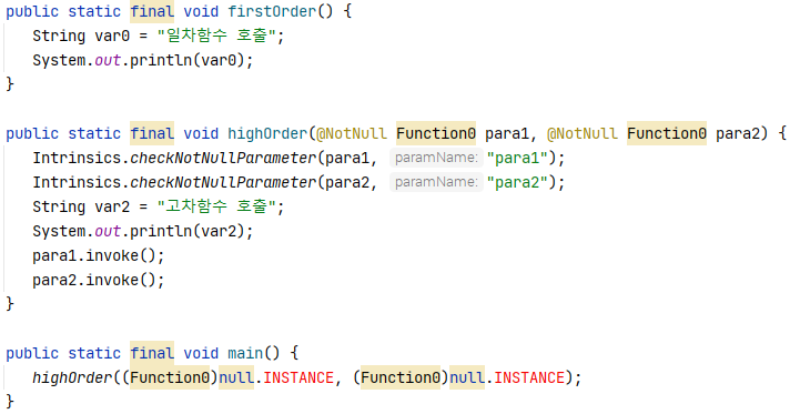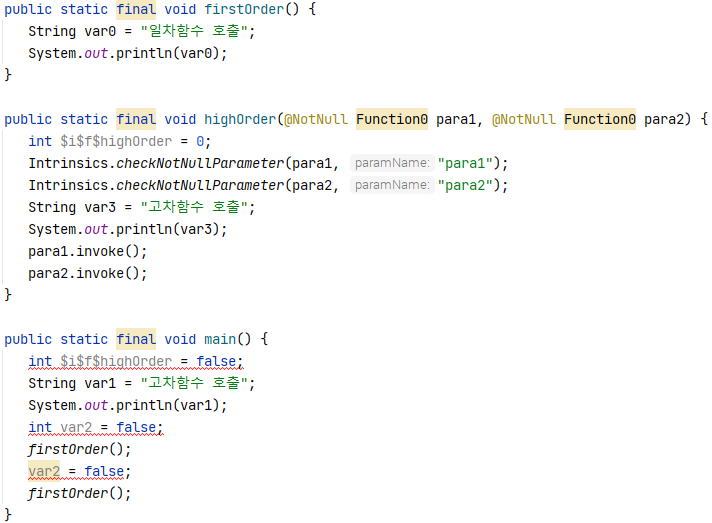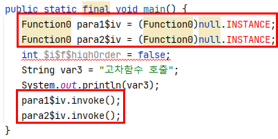 호출 전 고차함수의 인자에 해당하는 두 함수가 객체로 만들어지고, 고차함수의 내부에서 객체변수(para1,para2)의 invoke(실제함수의 카피본 함수)가 호출된다.