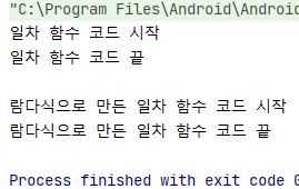 fun firstOrder(): Unit { println("일차 함수 코드 시작") println("일차 함수 코드 끝") } fun main() { val test: Function0<Unit> = ::firstOrder //함수 참조 //동일 val test: () -> Unit = ::firstOrder test.invoke() //동일 test() println() val test2: Function0<Unit> = { println("람다식으로 만든 일차 함수 코드 시작") println("람다식으로 만든 일차 함수 코드 끝") } //람다식 test2.invoke() //동일 test2() }