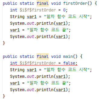 firstOrder함수를 호출하지 않고, firstOrder 함수 코드 전체가 main함수의 내부에 추가되었다.
