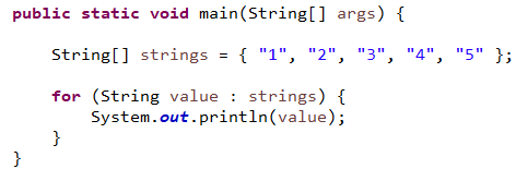 for(담겨있는타입 변수선언 : 배열 or Iterable구현객체) { //TODO }배열