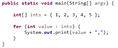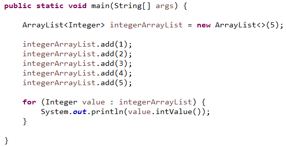 public static void main(String[] args) { ArrayList<Integer> integerArrayList = new ArrayList<>(5); integerArrayList.add(1); integerArrayList.add(2); integerArrayList.add(3); integerArrayList.add(4); integerArrayList.add(5); // for(초기화; 조건문; 수행코드;){ 반복 } // 초기화 -> 조건문 비교 -> 반복 -> 수행코드 -> 조건문 비교 -> ... for (Iterator<Integer> iterator = integerArrayList.iterator(); iterator.hasNext();) { System.out.println(iterator.next().intValue()); } }