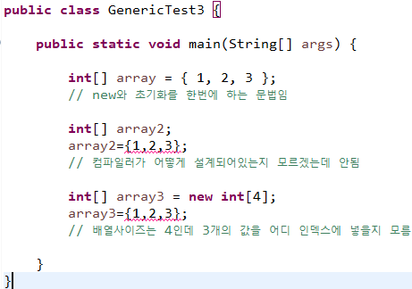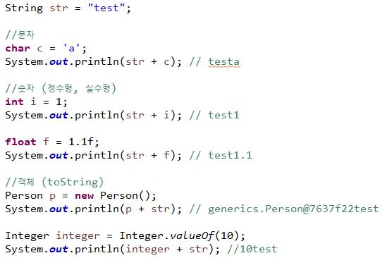 interface TestInterface { } class Person { } public class GenericTest3 { public static void main(String[] args) { // String String str = null; // 클래스 Person person = null; // 인터페이스 TestInterface testInterface = null; // 배열 int[] ints = null; Object[] objs = null; String[] strings = null; Person[] persons = null; } }