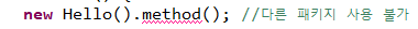 package protectedmodifier; public class Hello{ protected void method() { System.out.println("sjdflakjd"); } } class Hello2{ void method() { new Hello().method(); //같은 패키지 사용가능 } }다른 패키지 사용 불가