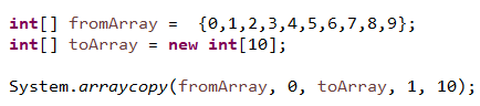 public class ArrayCopyTest { public static void main(String[] args) { int[] fromArray = {0,1,2,3,4,5,6,7,8,9}; int[] toArray = new int[20]; System.arraycopy(fromArray, 0, toArray, 10, 10); //from의 0번부터 , toArray의 10번부터, 10개를 for(int value: toArray) { System.out.print(value+","); } } }