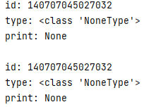 def info(obj): print('id:', id(obj)) print('type:', type(obj)) print('print:', obj) print() none_type = None info(none_type) none_type2 = None info(nonw_type2)