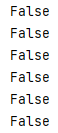 if []: print(True) else: print(False) if (): print(True) else: print(False) if {}: print(True) else: print(False) if set(): print(True) else: print(False) if "": print(True) else: print(False) if range(0): print(True) else: print(False)