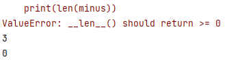 class Test: def __init__(self, value): self.value = value def __len__(self): return self.value three = Test(3) print(len(three)) zero = Test(0) print(len(zero)) minus = Test(-3) print(len(minus)) #에러