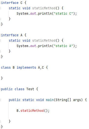 interface Inter1 { static void staticMethod() { System.out.println("Inter1"); } } interface Inter2 { static void staticMethod() { System.out.println("Inter2"); } } class C { static void staticMethod() { System.out.println("C"); } } class A extends C implements Inter1, Inter2 { //클래스와 여러 인터페이스의 충돌 -> 클래스 우선 } public class Test { public static void main(String[] args) { A.staticMethod(); //C } }인터페이스들간의 충돌 -> 컴파일러 몰라서 에러 발생 ( 인터페이스끼리는 다이아몬드 상속이 될 수도있어서 정하지 못하는 문제가 발생)
