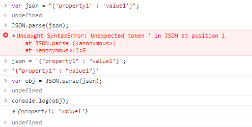 ' ' 를 감싸서 문자열을 생성하였을 때 JSON을 파싱하지 못한 것을 확인할 수 있다.