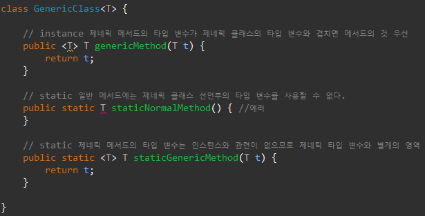 instance 메서드, static 메서드 둘다 타입 변수를 선언할 수 있다 (리턴타입 왼쪽에 타입 변수를 선언)