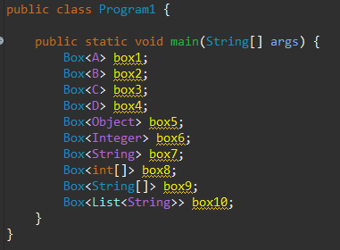class Box<T> { } public class Program1 { public static void main(String[] args) { Box<Object> box; //컴파일러는 box변수의 타입 Box<Object>을 확인하여 = new Box<>();시에 //= new Box<Object>();로 타입 추론한다. box = new Box<>(); } }