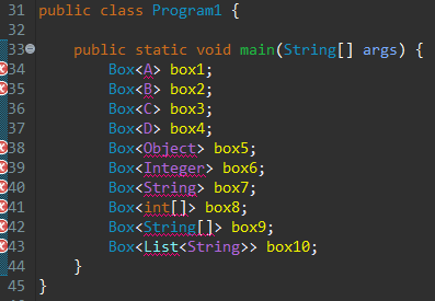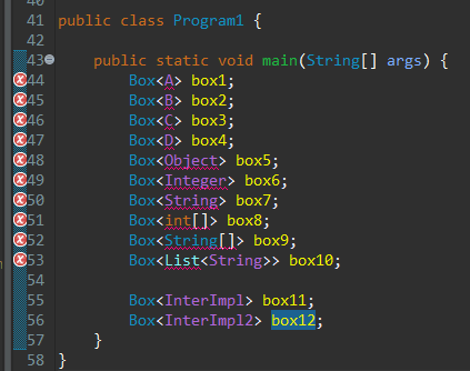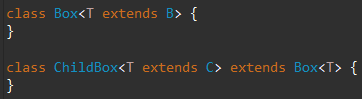 class A implements Inter { } class B extends A implements Inter { } class C extends B implements Inter { } class D extends C implements Inter { } class InterImpl implements Inter { } class InterImpl2 implements Inter { } interface Inter { } class Box<T extends B & Inter> { private T item; public T getItem() { return item; } public void setItem(T item) { this.item = item; } }