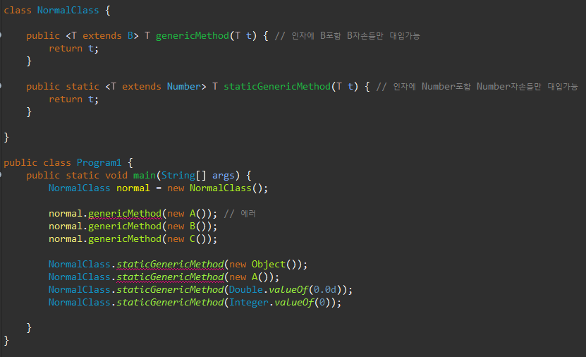 class GenericClass<T> { // instance 제네릭 메서드의 타입 변수가 제네릭 클래스의 타입 변수와 겹치면 메서드의 것 우선 public <T> T genericMethod(T t) { return t; } // static 일반 메서드에는 제네릭 클래스 선언부의 타입 변수를 사용할 수 없다. //public static T staticNormalMethod() { // 에러 //} // static 제네릭 메서드의 타입 변수는 인스턴스와 관련이 없으므로 제네틱 타입 변수와 별개 public static <T> T staticGenericMethod(T t) { return t; } } public class Program1 { public static void main(String[] args) { //클래스 선언부의 타입변수 T(String,Object)가 hiding 되고 Integer가 사용됨 Integer integer = new GenericClass<String>().genericMethod(Integer.valueOf(100)); Integer integer2 = new GenericClass<Object>().genericMethod(Integer.valueOf(100)); String str = GenericClass.staticGenericMethod(new String("헬로우")); } }제네릭 클래스의 대입될 타입의 제한(4번 항목)처럼 제네릭 메서드에도 타입 변수 선언부에 대입될 타입 제한을 걸수 있다.