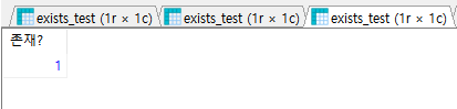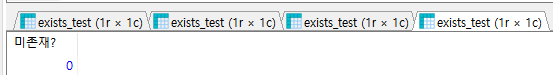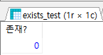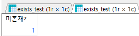 서브 쿼리에 해당하는 로우가 존재하지 않으면 true(1), 존재하면 false(0)CREATE TABLE exists_test (id INT); SELECT EXISTS(SELECT id FROM exists_test) AS '존재?' ; SELECT NOT EXISTS(SELECT id FROM exists_test) AS '미존재?'; INSERT INTO exists_test(id) VALUES(1); SELECT EXISTS(SELECT id FROM exists_test) AS '존재?' ; SELECT NOT EXISTS(SELECT id FROM exists_test) AS '미존재?';