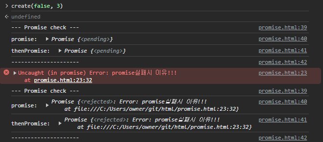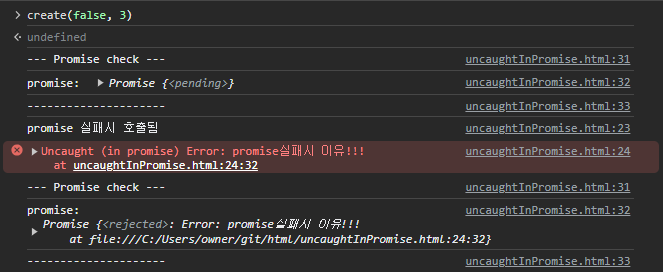 promise가 실패하는 경우 핸들링하지 않으면 Uncaught (in promise)가 발생한다.