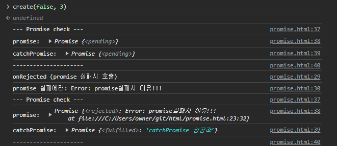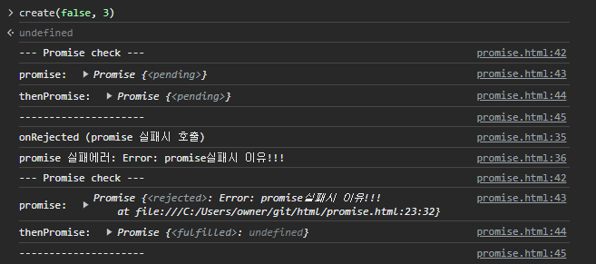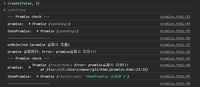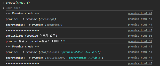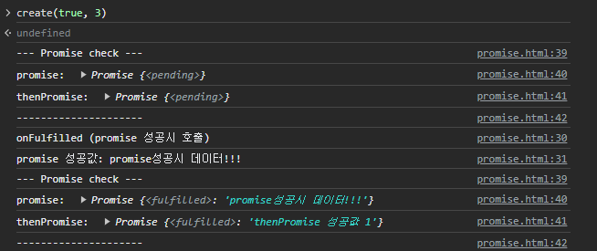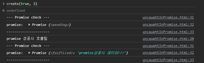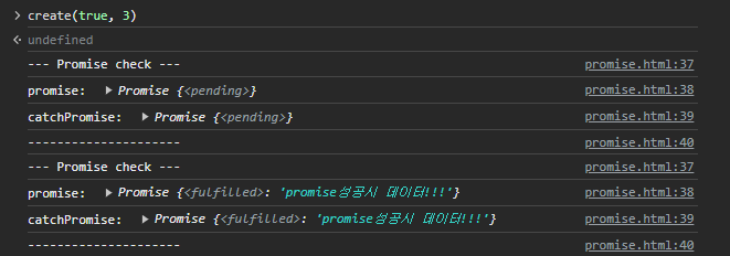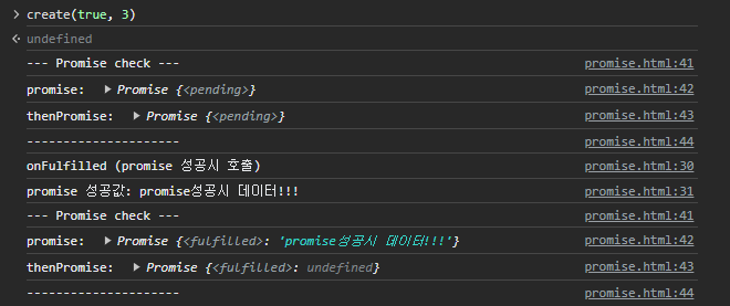 <!DOCTYPE html> <html lang="en"> <head> <meta charset="UTF-8"> <meta name="viewport" content="width=device-width, initial-scale=1.0"> <title>Promise</title> <link rel="icon" href="data:,"> </head> <body> <button onclick="checkPromise()">Promise 상태 확인</button> <script> let promise; function create(success, second) { promise = new Promise((resolve, reject) => { setTimeout(() => { if (success) { console.log('promise 성공시 호출됨') resolve('promise성공시 데이터!!!') } else { console.log('promise 실패시 호출됨') reject(new Error('promise실패시 이유!!!')) } }, 1000 * second) }) } function checkPromise() { console.log('--- Promise check ---') console.log('promise: ', promise) console.log('---------------------') } </script> </body> </html>create 호출 후 -> Promise 상태 확인 클릭 - > Promise가 완료(성공/실패)된 후 Promise 상태 확인 클릭