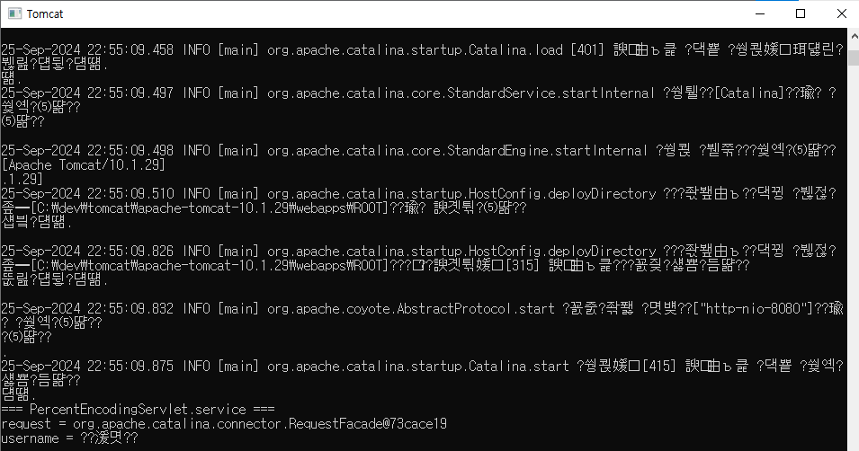 @WebServlet("/test/percentEncoding") public class PercentEncodingServlet extends HttpServlet { @Override protected void doGet(HttpServletRequest request, HttpServletResponse response) throws ServletException, IOException { System.out.println("=== PercentEncodingServlet.doGet ==="); System.out.println("request = " + request); String username = request.getParameter("username"); System.out.println("username = " + username); } @Override protected void doPost(HttpServletRequest request, HttpServletResponse response) throws ServletException, IOException { System.out.println("=== PercentEncodingServlet.doPost ==="); System.out.println("request = " + request); String username = request.getParameter("username"); System.out.println("username = " + username); } }요청: http://localhost:8080//test/percentEncoding?username=홍길동