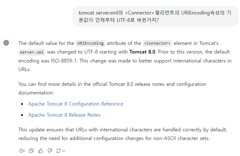 구버전 tomcat의 경우에는 default값이 UTF-8이 아님 만약 이 값을 다른 charset으로 변경한 후