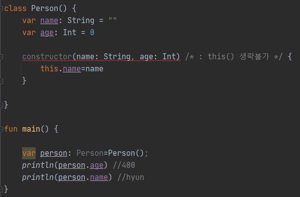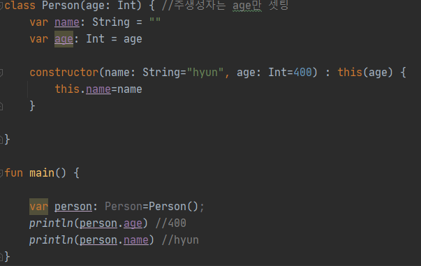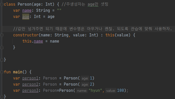 class Person(personName: String, personAge: Int) { var name: String var age: Int init { name = personName //initialization block age = personAge } } fun main() { var person:Person=Person("hyun",1000) }보이는가 constructor(personName:String, personAge:Int) 주생성자 선언부분에는 코드 초기화 부분을 넣을 수 없어 그냥 클래스 바디에 init{}블록에 주생성자 관련한 초기화 로직을 넣는 것이다.