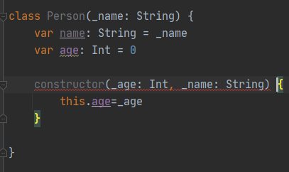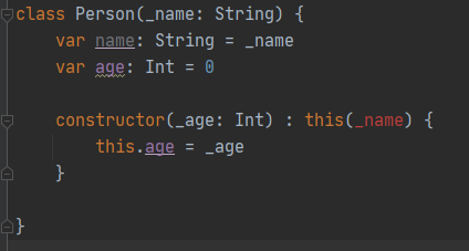 class Person(_name: String){ var name: Sring= _name var age: Int= 0 constructor(_age: Int, _name: String): this(_name){ this.age= age } }주생성자의 인자가 여럿 일때