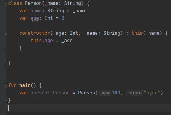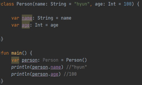 class Person(personName: String, personAge: Int) { var name: String var age: Int init { name = personName age = personAge } } fun main(){ var person: Person= Person("hyun", 1000) println(person.name) //hyun println(person.age) //1000 }매개변수를 property로 지정한 경우