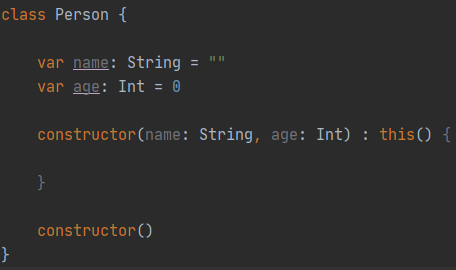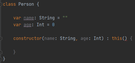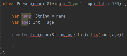 class Person{ private String name; private int age; public Person(String personName, int personAge) { name=personName; age=personAge; } } public class Test { public static void main(String[] args) { Person person=new Person("hyun",1000); } }in kotlin