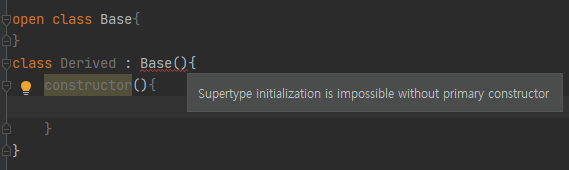 class Person( test1: String, test2: Int) { //가능 constructor( test1: String , test2: Int, test3: Int) : this( test1 , test2) { } //에러 //중복된 생성자. 생성자 오버로딩 만족x (주생성자와 부생성자 인자형태가 같다) constructor( test1: String , test2: Int) : this (test1, test){ //에러 //주생성자에게 위임하기 위해서는 주생성자에 포함된 인자를 모두 넘겨야 한다. //test2: Int 인자를 넘기지 않았다. constructor( test1: String ) : this( test1 ){ } }상속받은 주생성자에게 Int형이라는 값만 넘겨주면 되기 떄문에
