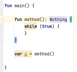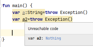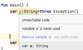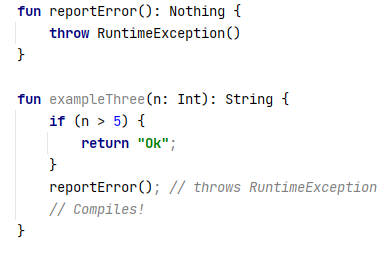 fun reportError(): Nothing { throw RuntimeException() }리턴타입을 생략하면 Unit으로 취급되기 때문에 리턴타입에 Nothing으로 사용하려면 꼭 명시적으로 써야한다.