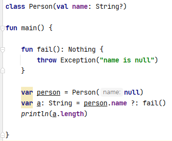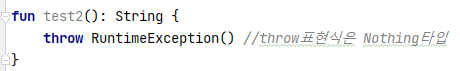 코틀린에서 throw 표현식은 Nothing타입이다. Nothing은 모든 타입의 서브타입이기 때문에 어떠한 타입으로도 캐스팅 될 수 있다. String으로 캐스팅될 수 있기 때문에 메서드는 컴파일 에러가 발생하지 않는다.
