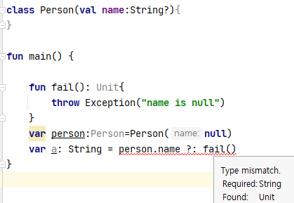 Elvis operator의 우변이 Unit타입이라 컴파일 에러가 발생한다.