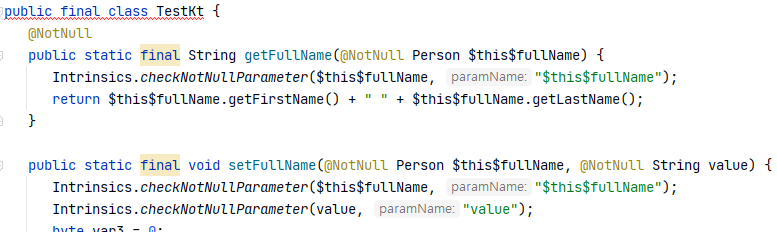 확장함수는 파일명.kt 파일의 class나 function이 아닌 top-level에 선언하였으므로 -> 파일명Kt 클래스 안에 포함되어있다. 디컴파일된 코드를 보면 getName 메서드가 파라메터만 다르게 오버로딩되어있는 것을 볼 수 있다.