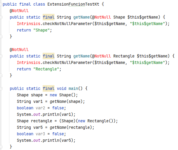 open class Shape class Rectangle : Shape() fun Shape.getName() = "Shape" fun Rectangle.getName() = "Rectangle" fun main() { val shape: Shape = Shape() println(shape.getName()) val rectangle: Shape = Rectangle() println(rectangle.getName()) //Shape. Rectangle x }조상 자손간의 메서드 오버라이딩의 동작에 의해 Rectangle이 출력되어야 한다고 생각할 수 있다.
