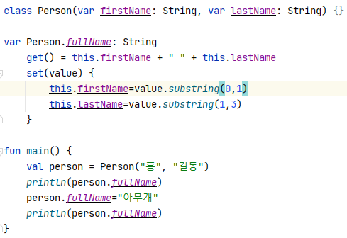 Extension Function처럼 getter,setter에서 this를 사용할 수 있다.
