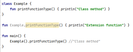 If a class has a member function, and an extension function is defined which has the same receiver type, the same name, and is applicable to given arguments, the member always wins.