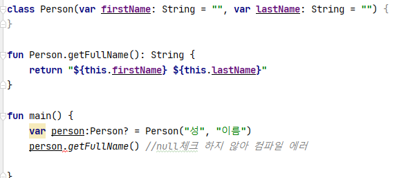 위의 getFullName 확장함수는 non-null변수일때만 사용가능하다.