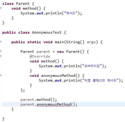 Parent 클래스를 상속한 익명 클래스는 독자적으로 anonymousMethod 메서드가 선언되어 있다.