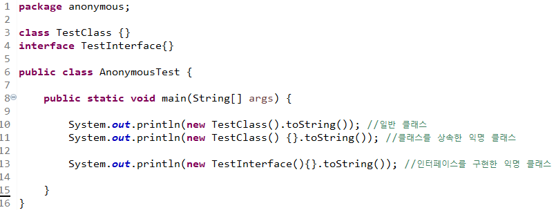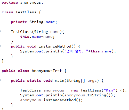 익명 클래스는 기존의 방식처럼 클래스를 선언하지 않고 코드상에서 한번쓰는 방식으로 선언할 수 있다.