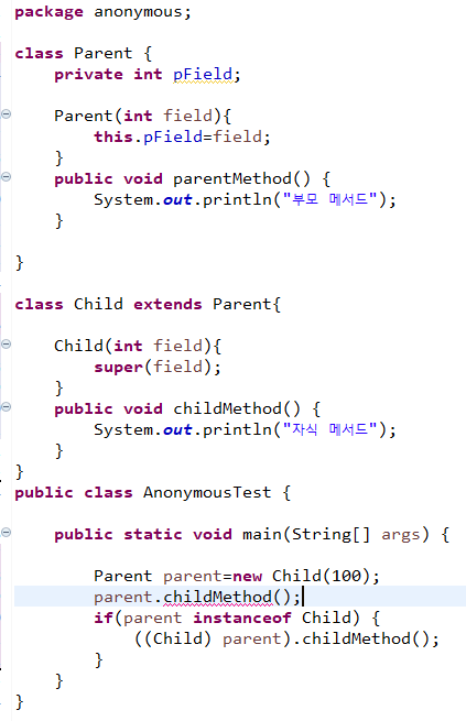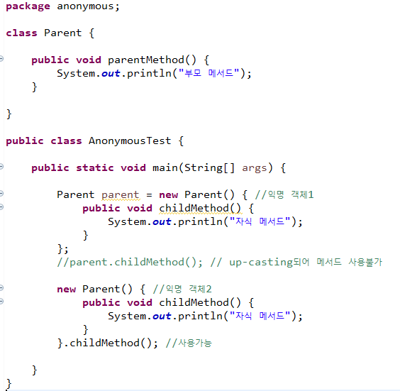 이러한 경우 익명 클래스에서는 Parent 타입 변수를 익명 클래스 타입으로 down casting 할 수 있는 방법이 없어서 anonymousMethod 메서드는 선언하였어도 절대 사용할 수 없다.