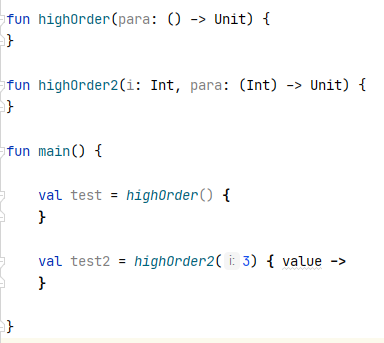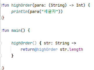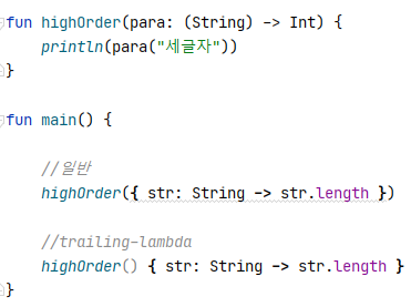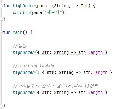 fun highOrder(para: (String) -> Int) { println(para("세글자")) } fun main() { //익명 함수 highOrder( fun(str: String): Int { return str.length } ) //람다식 highOrder( { str: String -> str.length } ) }