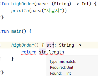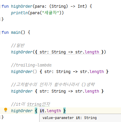 highOrder{ str: String -> str.length } 와 같이 str:String을 선언한 경우에는 it키워드를 사용하지 못한다.